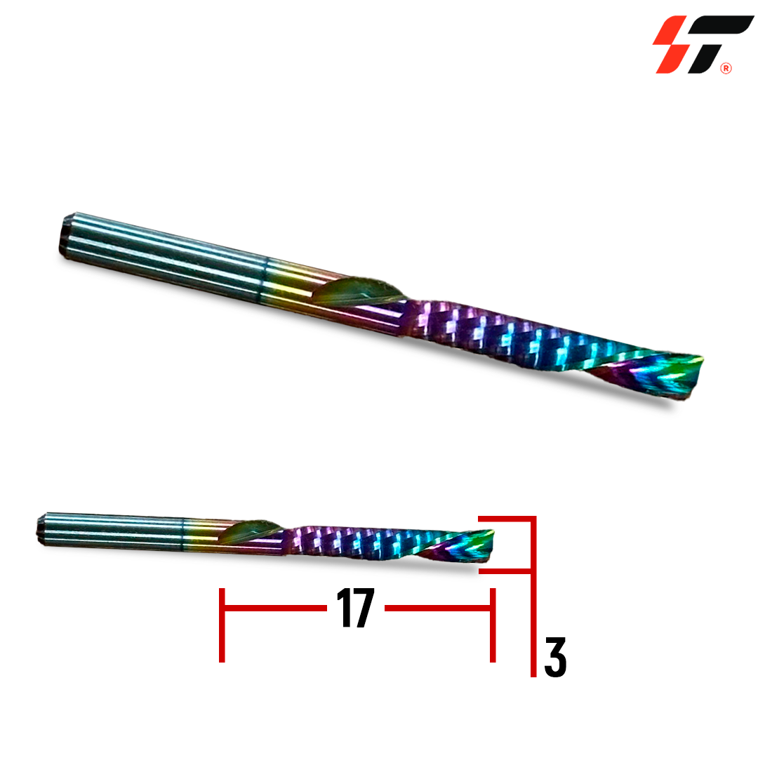 Фреза 1-зах. (3,175*17) стружка вниз (Цветная) — это однозаходная фреза с диаметром 3,175 мм и рабочей длиной 17 мм, оснащенная цветным покрытием для дополнительной защиты. Специальная конструкция с отводом стружки вниз предотвращает повреждение материала и обеспечивает высокое качество обработки.