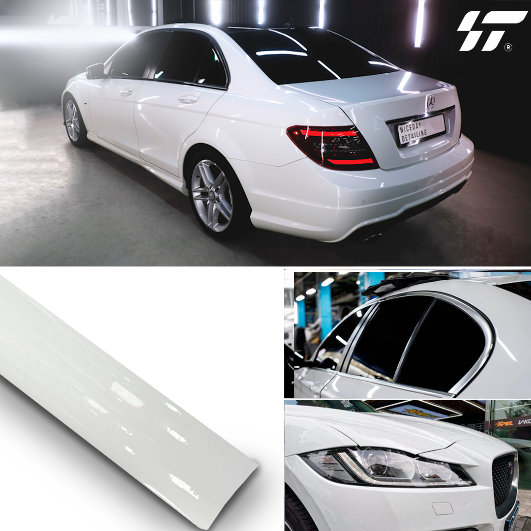 - Роскошный внешний вид: Пленка обладает ярким глянцевым блеском, придавая автомобилю элегантный и современный вид. Белый цвет создаёт эффект чистоты и свежести.